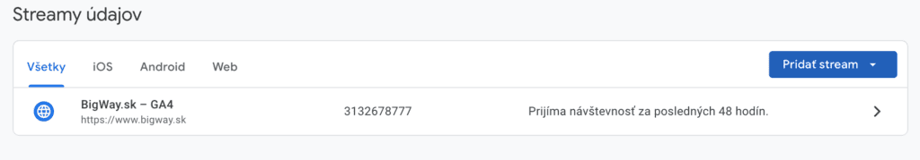 S GA4 môžete sledovať viacero dátových streamov (napríklad web a aplikáciu) v rámci jedného účtu. Nemusíte mať teda zvlášť účet pre aplikáciu iOS, aplikáciu Android a web. Všetko nájdete na jednom mieste, v jednom účte Analytics.