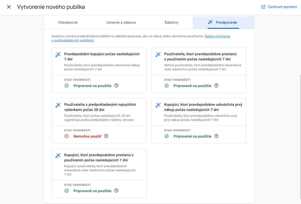 Vďaka strojovému učeniu dokáže GA4 predpovedať správanie používateľov a vytvárať publikum, napríklad pravdepodobných kupujúcich počas nasledujúcich 7 dní. Táto funkcia je však dostupná len pri väčšom objeme dát. (minimálne 1 000 vykonaných nákupov za posledný týždeň).