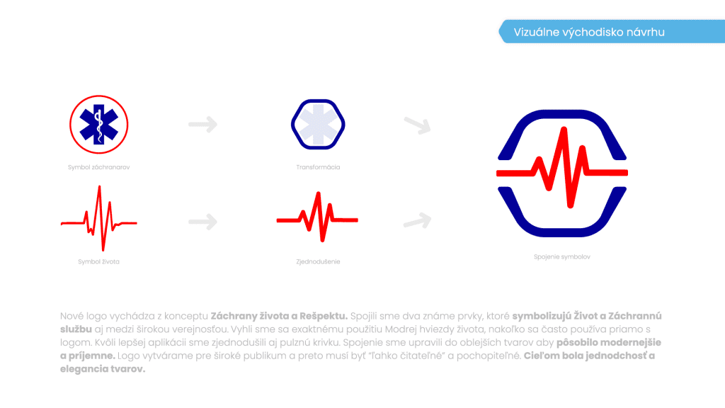 Život v našom návrhu reprezentuje typická pulzná krivka. Modrú hviezdu života, príznačnú pre záchrannú zdravotnú službu, sme nahradili hexagónom charakterizujúcim jej šesť ramien.